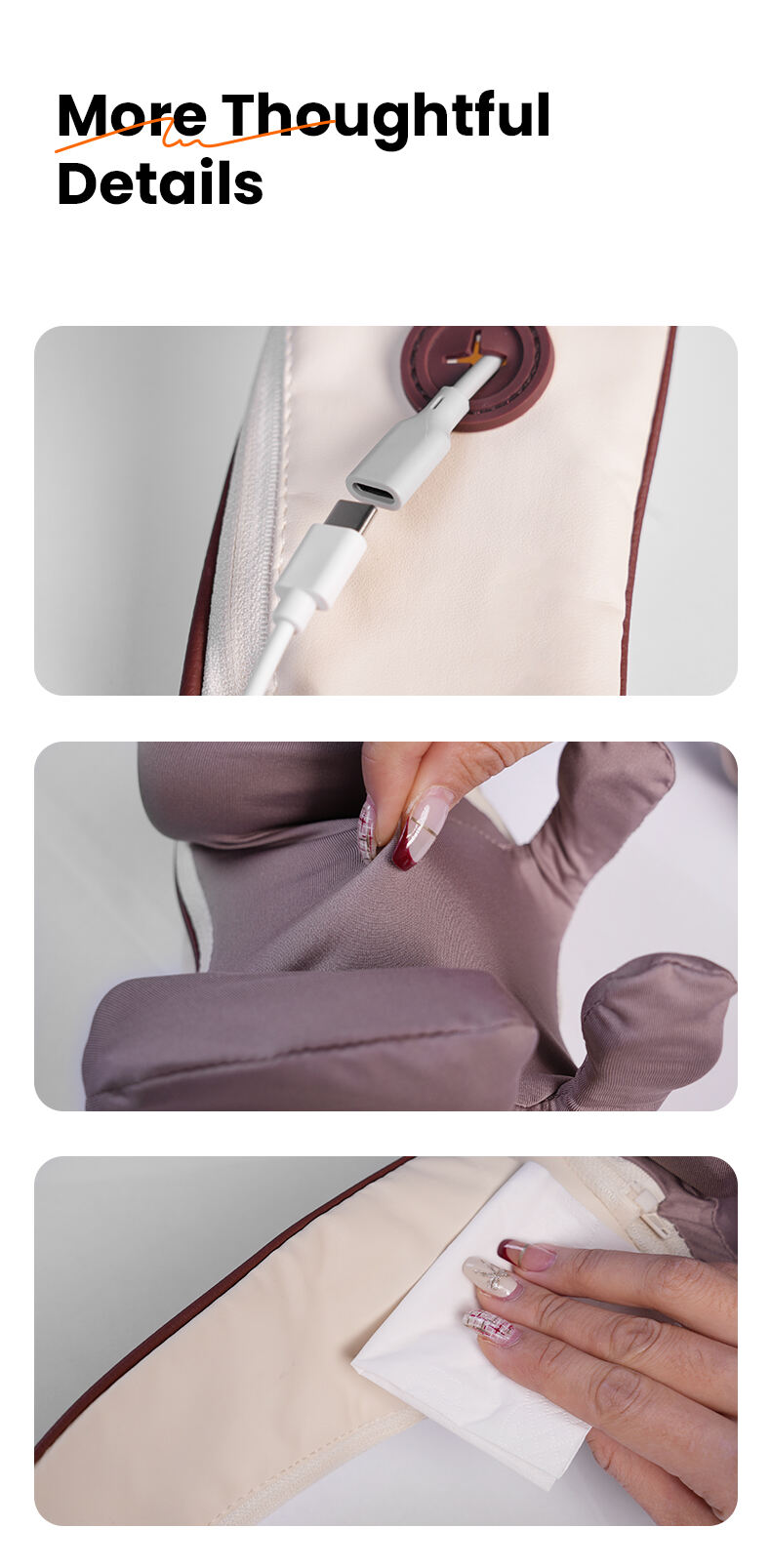 Благодаря интуитивно понятным элементам управления и легкой конструкции, этот массажер удобен в использовании и идеально подходит для расслабления в дороге. Беспроводная функция позволяет наслаждаться массажем в любом месте — дома, в офисе или даже в пути.